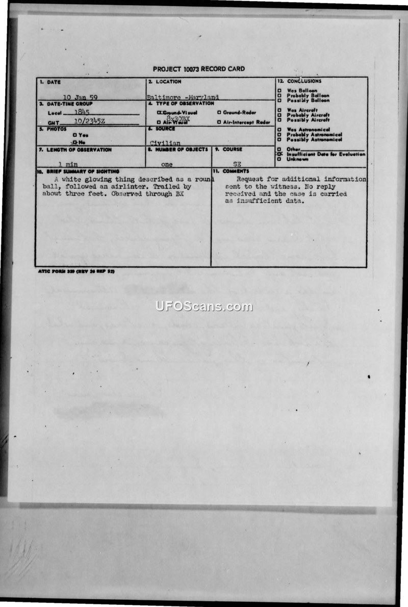 Project 10073 Record Card — Baltimore, Maryland, 10 January 1959