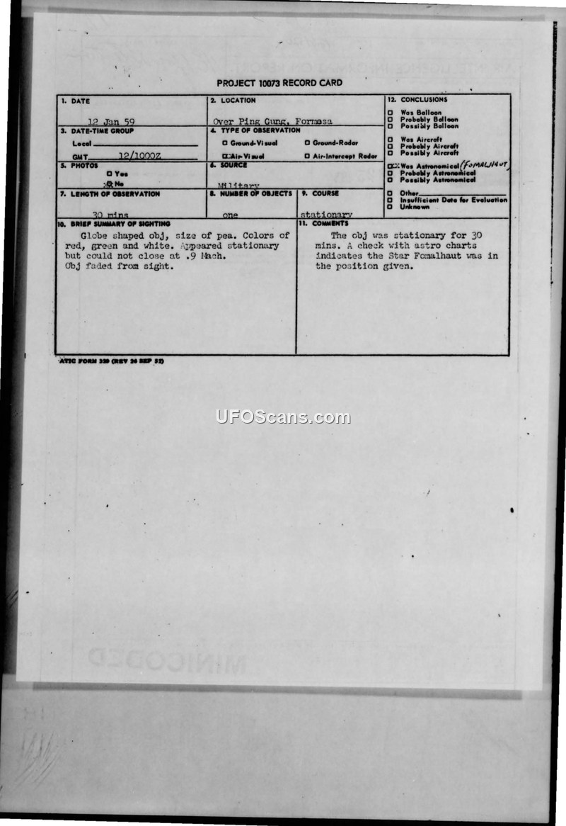 A 1959 sighting of a stationary, multi-colored object over Formosa was officially identified as the star Fomalhaut. The report was filed by the Directorate of Intelligence under Project 10073.