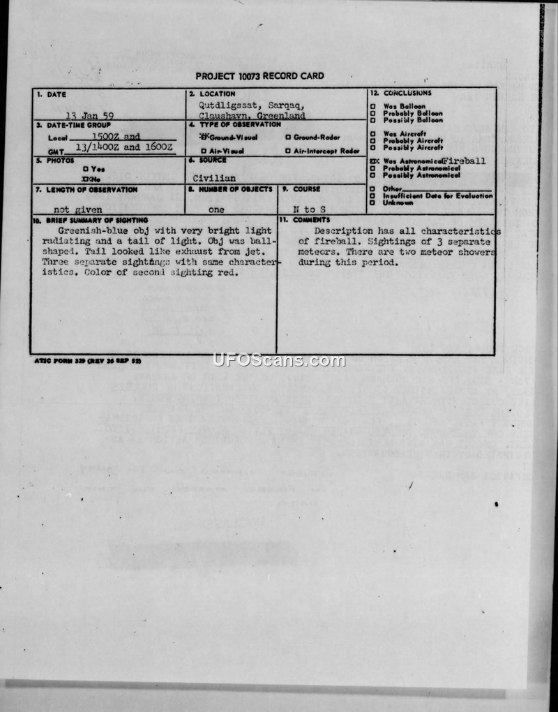 A series of sightings in Greenland in January 1959 involving ball-shaped and torpedo-shaped objects were officially attributed to meteor activity by the Air Technical Intelligence Center (ATIC).