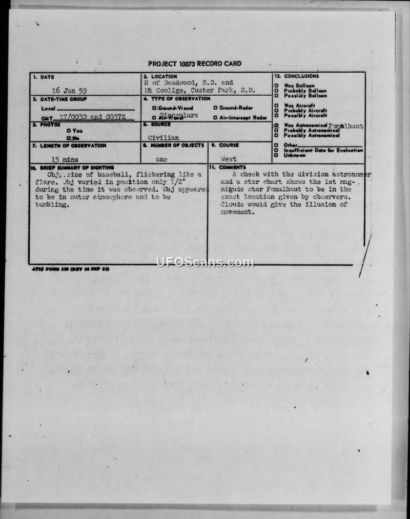 This document is a Project 10073 record card and associated teletype correspondence detailing a UFO sighting reported on January 16, 1959, in South Dakota. Two witnesses, identified as a forest ranger and a lookout observer for Custer State Park, reported observing a single object that appeared to be the size of a baseball and flickered like a flare. The object was described as moving slowly toward the west and was observed for approximately fifteen minutes before disappearing behind clouds. One observer noted that the object appeared to be in the outer atmosphere, looked like a satellite, and was tumbling. The sighting was reported from two different locations, with the first observation made from an automobile and the second from a lookout station using binoculars. The Air Technical Intelligence Center (ATIC) conducted an evaluation of the report. By consulting a division astronomer and a star chart, investigators concluded that the object was the first-magnitude star Fomalhaut, which was located in the exact position reported by the witnesses. The investigators further noted that the perceived movement of the object was likely an illusion caused by cloud cover.