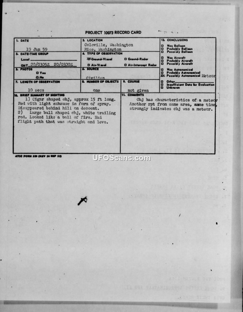 Project 10073 Record Card — Coleville, Washington, 19 January 1959