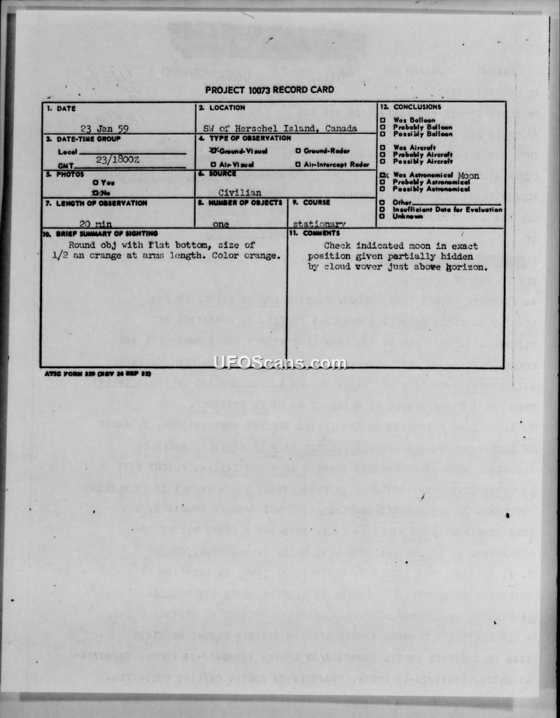 On January 23, 1959, at 1800Z, a civilian observer reported an unidentified flying object southwest of Herschel Island, Canada. The object was described as a round, orange-colored entity with a flat bottom, appearing to be the size of half an orange held at arm's length. The witness observed the object for approximately 20 minutes, noting that it appeared stationary at an angle of elevation of three to four degrees above the horizon. No optical aids were used during the observation. The report was relayed to Captain Donald R. Sandvig, the Data Center Duty Officer at the Barmain Station of the DEW Line. Weather conditions at the time were reported as clear with a few scattered clouds and an unlimited ceiling. Intelligence personnel from the 11th Air Division conducted a follow-up investigation, which included checking the position of the moon. The final assessment concluded that the object was the moon, which was in the exact position reported and partially obscured by cloud cover just above the horizon. Despite this identification, the intelligence comments noted that the duration of the observation and the stationary nature of the object led to the belief that it was not a man-made object.