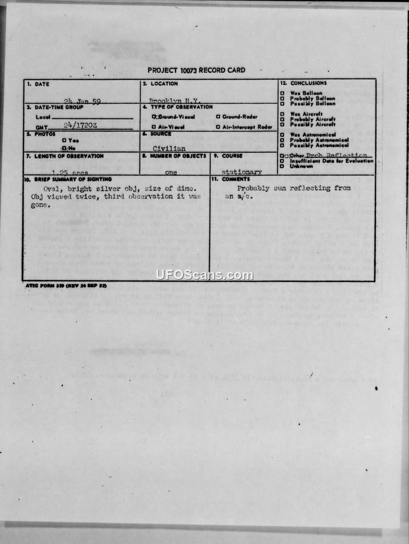 A 1959 sighting report from Brooklyn, New York, describing a stationary silver object. The Air Force concluded it was likely a sun reflection from an aircraft.