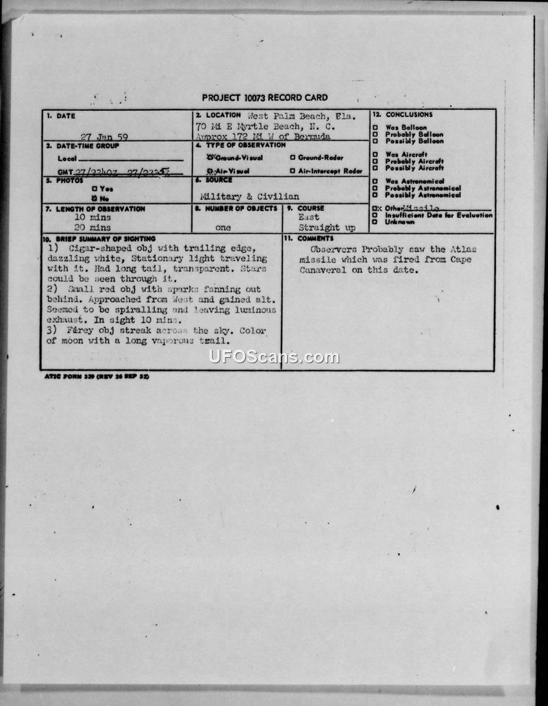 Multiple reports of a cigar-shaped object on January 27, 1959, were investigated by the Air Technical Intelligence Center. The sightings were officially attributed to the launch of an Atlas missile from Cape Canaveral.