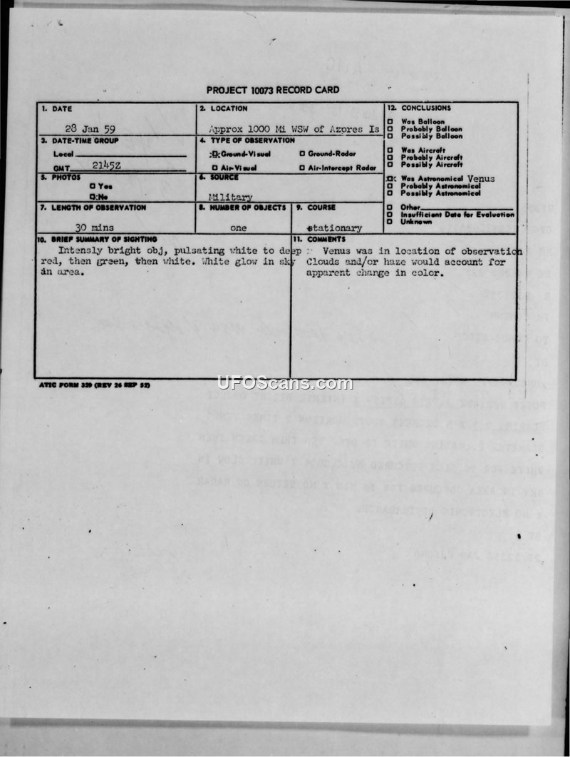 This document collection contains various records related to Unidentified Flying Object (UFO) sightings reported in January 1959. The primary document is a Project 10073 Record Card detailing a sighting on January 28, 1959, approximately 1000 miles west-southwest of the Azores. The witness reported an intensely bright object that pulsated between white, deep red, and green. The official conclusion for this incident was that the object was the planet Venus, with atmospheric conditions like clouds and haze causing the perceived color changes. The file also includes a report from the Office of Information Services regarding a sighting in Santa Monica, California, on January 3, 1959, where a witness described a cylindrical object with two silver tubes and black metal stringers. Additionally, the collection contains a press compilation from United Press International regarding various reports of 'mysterious' objects in North Carolina, Alabama, and Florida, which were largely attributed to bursting weather balloons. A significant portion of the document consists of a personal letter from a resident of Bay Shore, Long Island, dated March 30, 1966, describing a sighting from seven years prior. The author, an aircraft mechanic, provides a detailed, albeit highly subjective, account of an object that hovered over a millpond, discharged 'hot coal-red-sparks-matter,' and possessed a canopy that glowed with a greenish fluorescence. The author attempts to link this experience to astronomical theories about quasars and meteorites, and mentions finding a strange, petrified object on the beach that resembled a female urethra. The document also includes a summary table of 'February 1959 Sightings,' which categorizes various reports as aircraft, meteors, reflections, or balloons. The collection serves as a snapshot of the Air Force's administrative process for handling public reports of aerial phenomena during the late 1950s, illustrating the mix of mundane explanations, such as weather balloons and astronomical bodies, alongside more idiosyncratic and unverified personal accounts.
