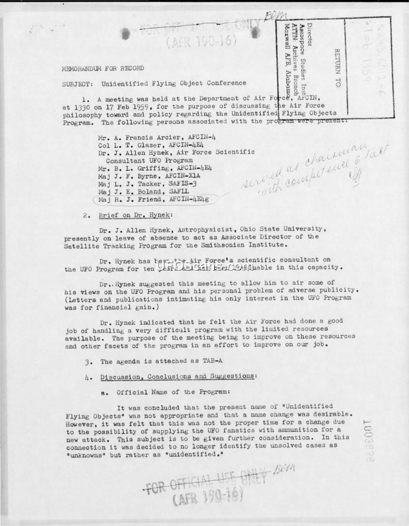 This document is a Memorandum for Record dated February 17, 1959, detailing a conference held at the Department of the Air Force to discuss the philosophy and policy regarding the Unidentified Flying Objects (UFO) Program. Attendees included key Air Force personnel and Dr. J. Allen Hynek, the Air Force's scientific consultant. The meeting addressed several critical issues, including the negative public perception of the program, the need for a more scientific approach to investigations, and the management of 'UFO fanatics.' A primary concern was the adverse publicity surrounding Dr. Hynek, with the consensus being that he should remain in his position due to his value, but his name should be omitted from official releases to mitigate criticism. The conference concluded that the term 'Unidentified Flying Objects' was inappropriate, though a name change was deferred to avoid providing ammunition to critics. The Air Force decided to stop labeling unsolved cases as 'unknowns,' opting for 'unidentified' instead. Furthermore, the document outlines a plan to revamp investigation procedures, including the revision of AFR 200-2, the implementation of a 20-hour training course for investigators, and the provision of specific equipment such as Geiger counters and cameras. The document also suggests forming a panel of qualified experts in sociology, astronomy, psychology, physics, and public relations to consult on troublesome cases. The memorandum includes an index of supporting tabs, statistics on sightings from 1947 to 1958, and correspondence from private organizations and individuals, such as Dan B. Haber, who challenged the Air Force's transparency. The overall tone reflects a strategic shift toward a more controlled, scientific, and public-relations-conscious management of the UFO phenomenon, aiming to reduce the 'snow-balling' of reports and the influence of private UFO organizations.