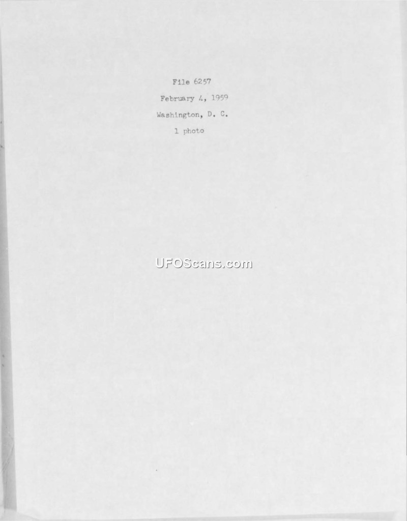 This document, identified as File 6257, consists of a brief administrative record dated February 4, 1959, and an accompanying photograph. The text explicitly states the location as Washington, D. C., and notes the inclusion of one photograph. The second page of the document provides the visual content, which is a black-and-white night photograph depicting a cityscape with a prominent, illuminated structure at the center, surrounded by various smaller lights. The document provides no further context, narrative, or analysis regarding the nature of the photograph or the reason for its inclusion in the file.