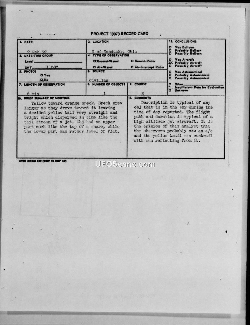 Project 10073 Record Card — Sighting near Sandusky, Ohio, 2 February 1959
