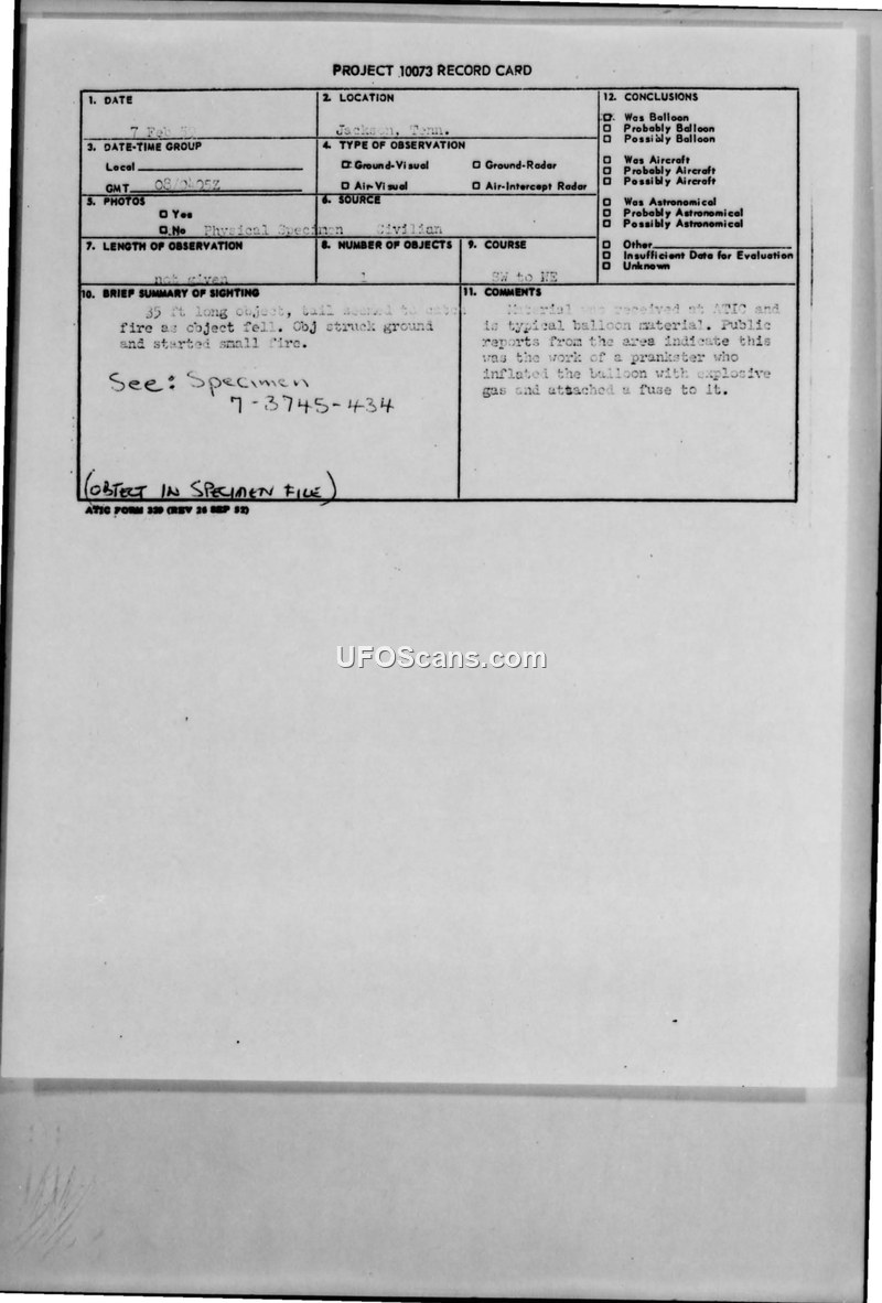 A 35-foot object sighted in Jackson, Tennessee, on February 7, 1959, was determined by ATIC to be a balloon rigged with explosive gas and a fuse by a prankster.