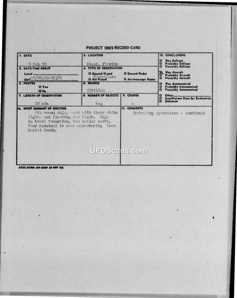 A sighting of six round objects with flashing lights in Miami, Florida, on February 9, 1959, was officially identified as aircraft involved in refueling operations.