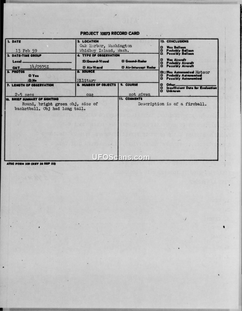 Multiple military personnel at Whidbey NAS reported a bright green, basketball-sized object emerging from the water on February 14, 1959. The incident was investigated by ATIC and Naval ONI, ultimately concluding the object was a fireball.