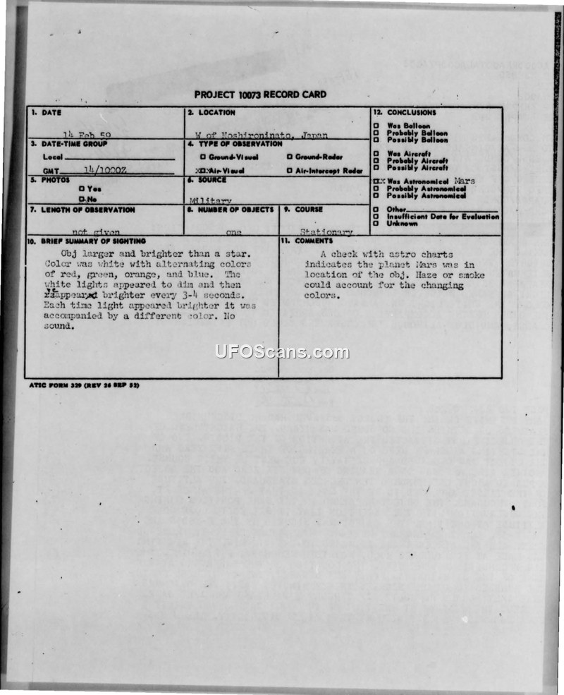 Project 10073 Record Card — Sighting near Noshironinato, Japan, 14 February 1959