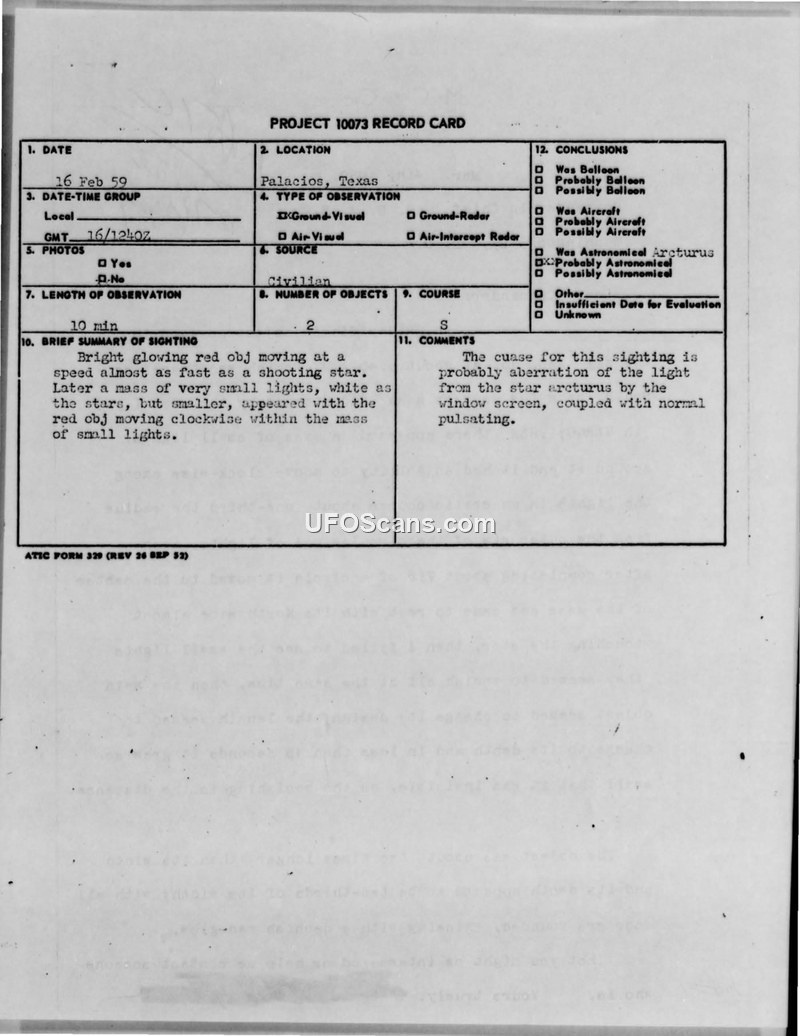 A civilian in Palacios, Texas, reported a red glowing object and a cluster of lights on February 16, 1959. The Air Force concluded the sighting was an optical illusion caused by viewing the star Arcturus through a window screen.