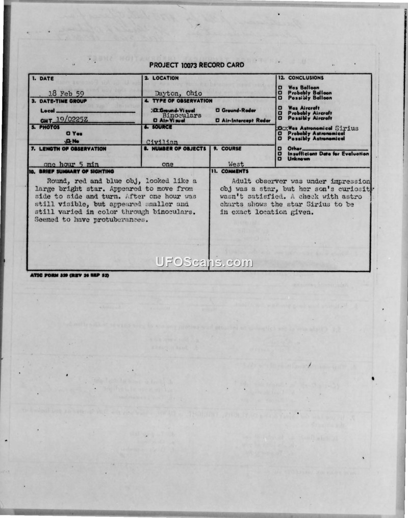 Project 10073 Record Cards and Technical Information Sheets — Dayton, Ohio, 18 February 1959