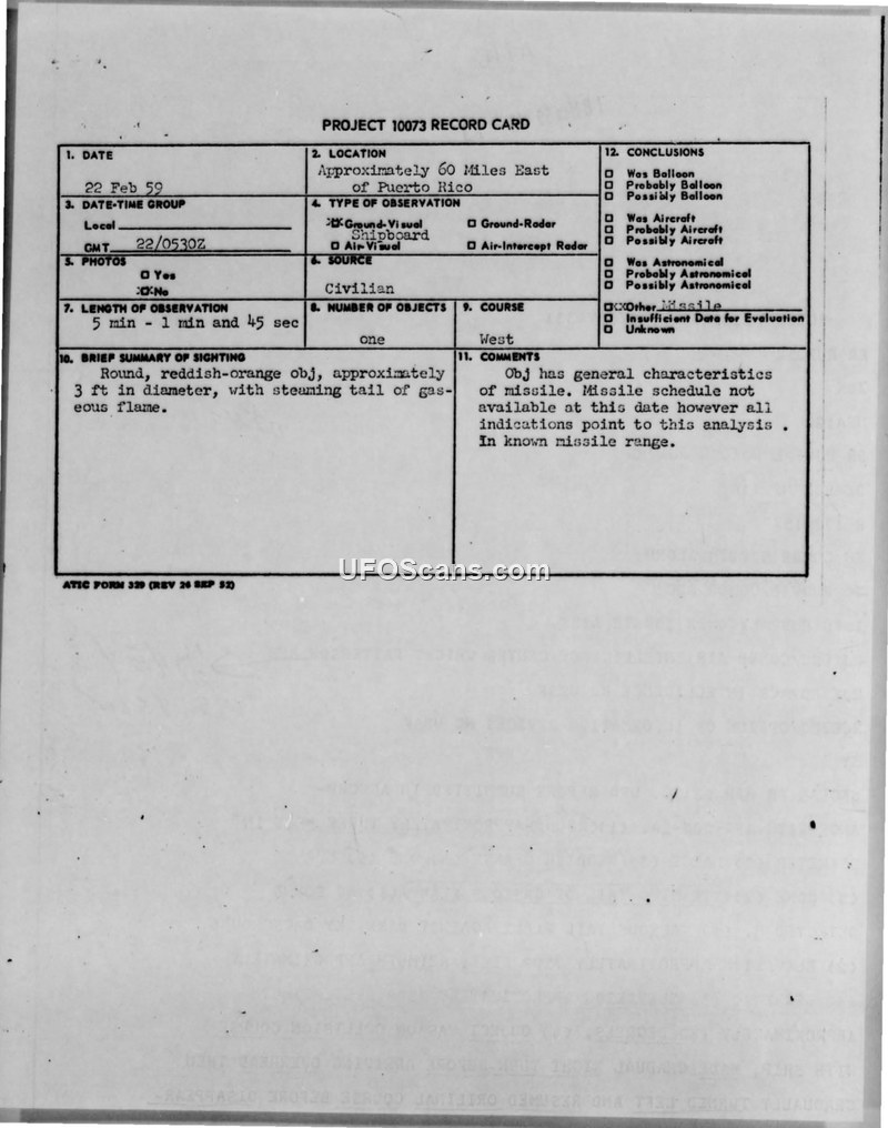 A 1959 UFO sighting by the crew of a Dutch merchant vessel near Puerto Rico was investigated by the Air Technical Intelligence Center. The object was officially concluded to be a missile based on its characteristics and the location of the sighting within a known missile range.