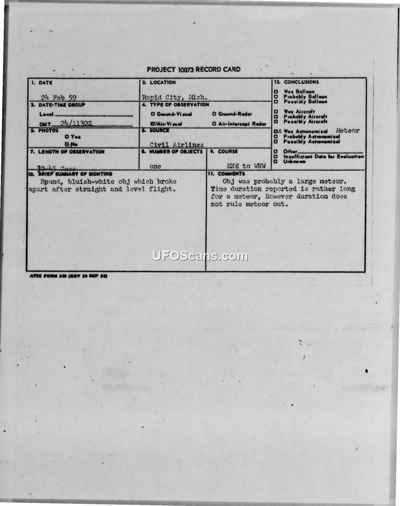 Project 10073 Record Card — Rapid City, Michigan, 24 February 1959