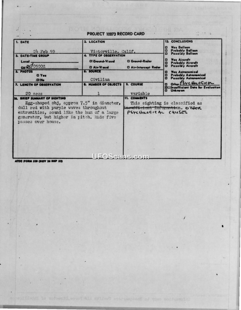Project 10073 Record Card and Air Intelligence Information Report — Victorville, California, February 1959