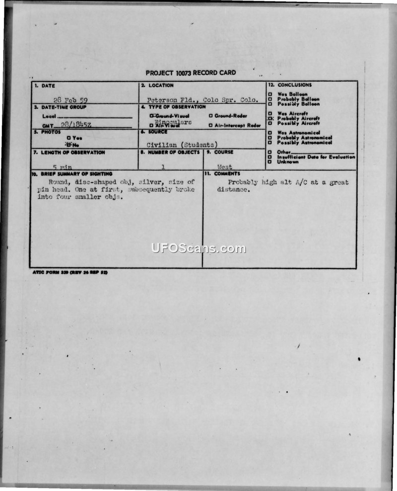 On 28 February 1959, two students at Peterson Field, Colorado, observed a silver, disc-shaped object that split into four smaller objects. Military intelligence concluded the sighting was likely high-altitude aircraft.