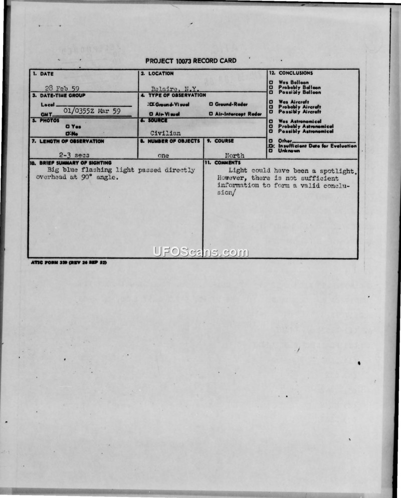 Project 10073 Record Card — Belaire, N.Y., 28 Feb 59