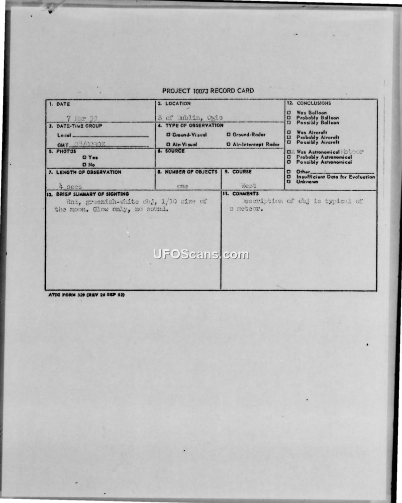 A civilian reported a greenish-white glowing object in the sky near Dublin, Ohio, on March 8, 1959. The Air Force investigated the incident and concluded the object was a meteor.