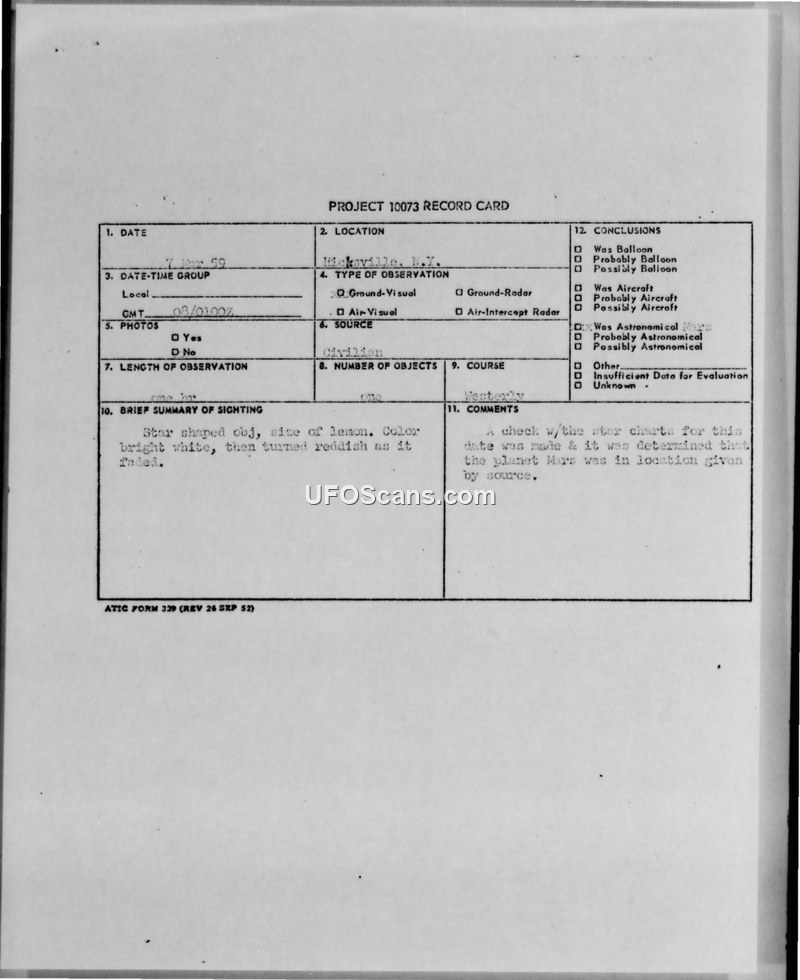 A machinist in Hicksville, New York, reported a star-shaped object on 8 March 1959. Military investigators concluded the object was the planet Mars after consulting star charts.