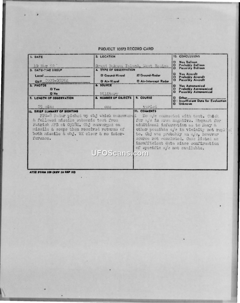 An unidentified object was tracked by FPS-6 radar following a missile test near Grand Bahama Island on March 10, 1959. Military intelligence requested further data to evaluate the sighting, which was ultimately classified as having insufficient data for a definitive conclusion.