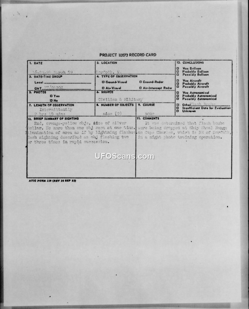 This document contains a collection of records, correspondence, and a Project 10073 record card regarding a series of UFO sightings reported in the Norfolk, Virginia area in March 1959. The primary witness, a local art teacher, reported observing a large, ball-like, orange-yellow object that emitted intense flashes of light, which she initially mistook for lightning. The witness, who was with her son, described the object as hovering and later appearing to land. She was so impressed by the event that she created a pastel drawing of the phenomenon. The investigation was handled by 1st Lieutenant Gene E. Taft of the 345th Bombardment Wing, who coordinated with the Air Technical Intelligence Center (ATIC). Upon investigation, it was determined that the sightings coincided with night photo training operations conducted by the 363rd Tactical Reconnaissance Wing, based at Shaw AFB, South Carolina. These aircraft were dropping flash bombs at the Ship Shoal Range, located northeast of Norfolk. The azimuth and elevation reported by the witnesses were found to align with the location of the training range. Lt. Taft concluded that the reported objects were indeed the flash bombs used during these training exercises. The witness's drawing was reviewed by military personnel, who noted it depicted only a 'blob of light.' The military ultimately decided not to require the drawing for their records, and the case was closed with the explanation that the sightings were the result of military training activities.