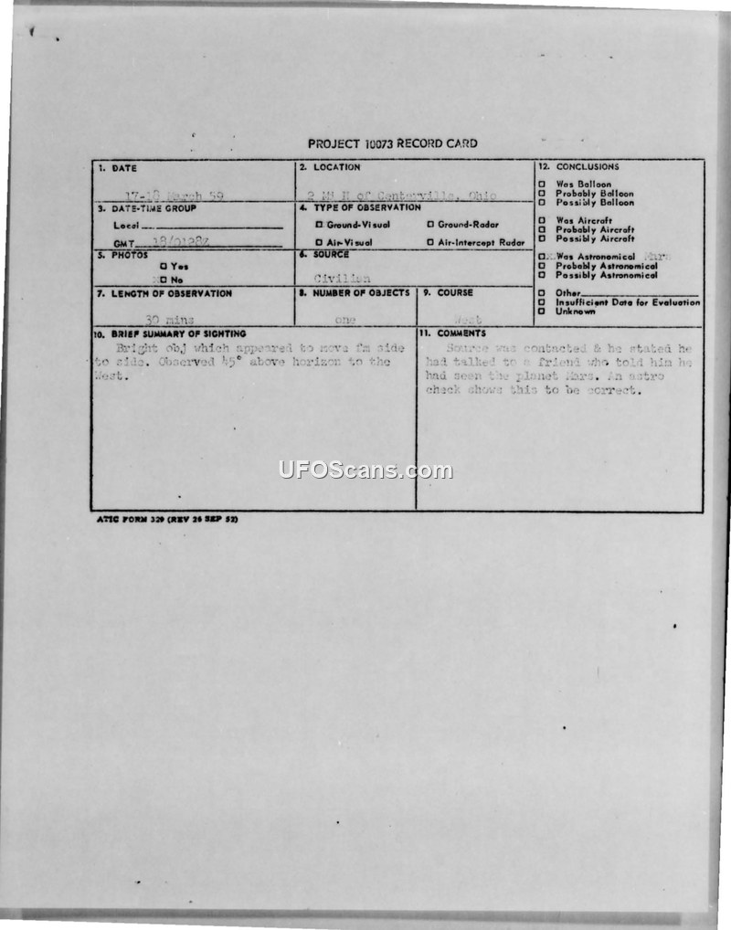 A civilian sighting of a bright object in Centerville, Ohio, in March 1959 was investigated by ATIC. The object was officially identified as the planet Mars following an astronomical check.