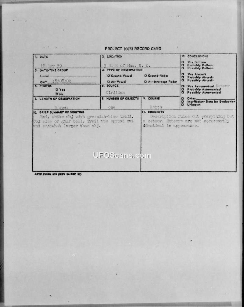 A civilian reported a round, white object with a greenish-blue trail near Max, North Dakota, on March 18, 1959. Despite the witness's insistence that it was not a meteor, the Air Technical Intelligence Center (ATIC) concluded the object was a meteor.
