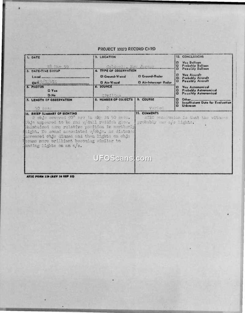 On March 18, 1959, at approximately 8:40 PM, Jesse Wilson, a professional photographer and aeronautical engineer, observed and photographed unidentified objects in the sky over Caldwell, New Jersey. Wilson, using a Super Ikonto B camera and a 38-power refractor telescope, captured a series of images showing 34 fish-tail-like objects in an arcing line. The objects initially appeared as a dull reddish glow, then transitioned to a brilliant white light as they moved behind trees. Wilson, who had extensive experience in photography and astronomy, ruled out camera static or double exposure, noting that the images were distinct and not present on other frames of the film. The sighting was reported to the Air Technical Intelligence Center (ATIC) and investigated by various experts, including astronomers and photographic specialists from LIFE and LOOK magazines. While some experts were baffled by the unique nature of the images, others suggested potential causes like camera static or reflections. The U.S. Air Force, specifically the 1006th Air Intelligence Squadron and ATIC, conducted an analysis of the report and the provided photographs. They considered the possibility of satellites or experimental devices but ultimately concluded that the objects were likely aircraft lights. The Air Force calculated that if the objects were at an altitude of 50,000 feet, their speed would be approximately 600 knots, which is consistent with jet aircraft. Despite the skepticism of some experts and the witness's own professional background, the official government position remained that the phenomenon was likely attributable to conventional aircraft.