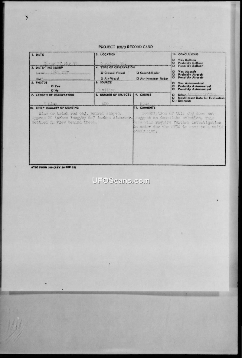 This document contains a series of records, including a Project 10073 record card, correspondence, and a completed U.S. Air Force Technical Information Sheet regarding an unidentified aerial object sighting in Sigel, Pennsylvania, in March 1959. The primary witness, an unnamed uncle of the correspondent, observed a barrel-shaped object, described as wine or brick red in color and approximately 20 inches long by 6-7 inches in diameter. The object was reported to be anchored in the air, approximately 40 to 50 feet above the ground, and appeared solid. The witness and his daughter observed the object from their porch for approximately three minutes before the witness moved closer to the yard, at which point he lost sight of it. The witness believed the object did not move back up into the air and speculated it may have floated down a valley or into the woods. The correspondent, who acted as an intermediary for the Air Force, noted that the witness was hesitant to speak about the incident due to concerns about people returning to his property. Major Lawrence J. Tacker of the U.S. Air Force responded to the initial report on May 25, 1959, stating that the provided information was insufficient to reach a valid conclusion and requested that the witness complete a formal technical information sheet. The witness subsequently provided additional details, including sketches of the object's position relative to the local landscape, which included a grain field and woods. Despite the detailed account provided by the witness, the Air Force maintained that the data was insufficient for a formal evaluation, and the case remained unresolved.