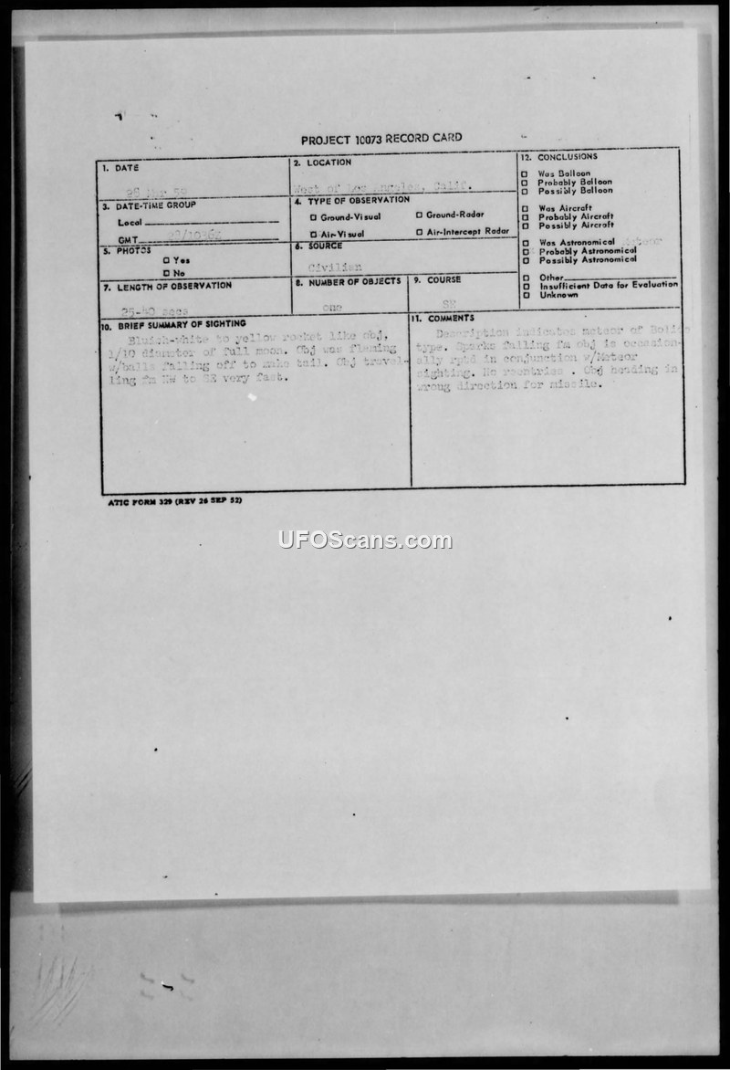 Multiple airline pilots reported a fast-moving, flaming, rocket-like object over California on March 28, 1959. Military investigators concluded the object was likely a meteor, rocket, or satellite.