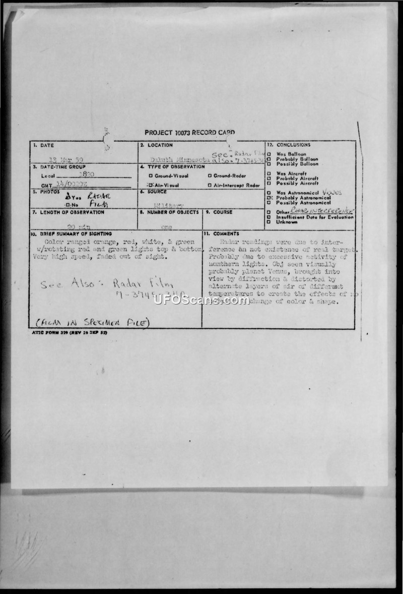 Military personnel in Duluth, Minnesota reported UFO sightings on 13-14 March 1959, involving both visual and radar observations. ATIC concluded the events were caused by atmospheric refraction of Venus and radar interference from the Aurora Borealis.