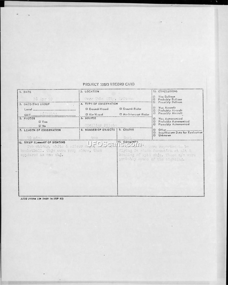 TWA pilots reported two oblong objects over Tuba City, Arizona, on April 16, 1959. Intelligence officials concluded the objects were likely two B-47 aircraft flying in close formation.