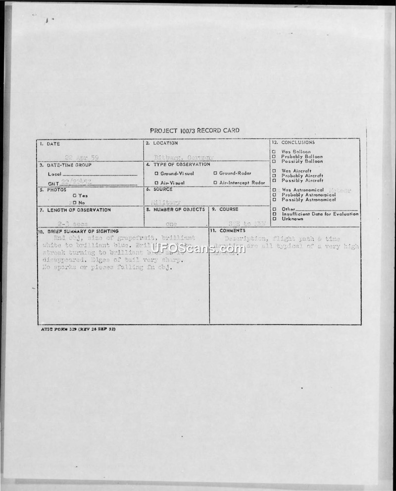 A 1959 sighting report from Bitburg, Germany, describes a brilliant, grapefruit-sized object. ATIC investigators concluded the event was likely a high-altitude meteor.