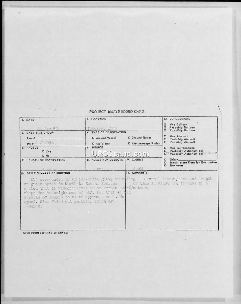 Project 10073 Record Card — Teheran, Iran, 24 April 1959