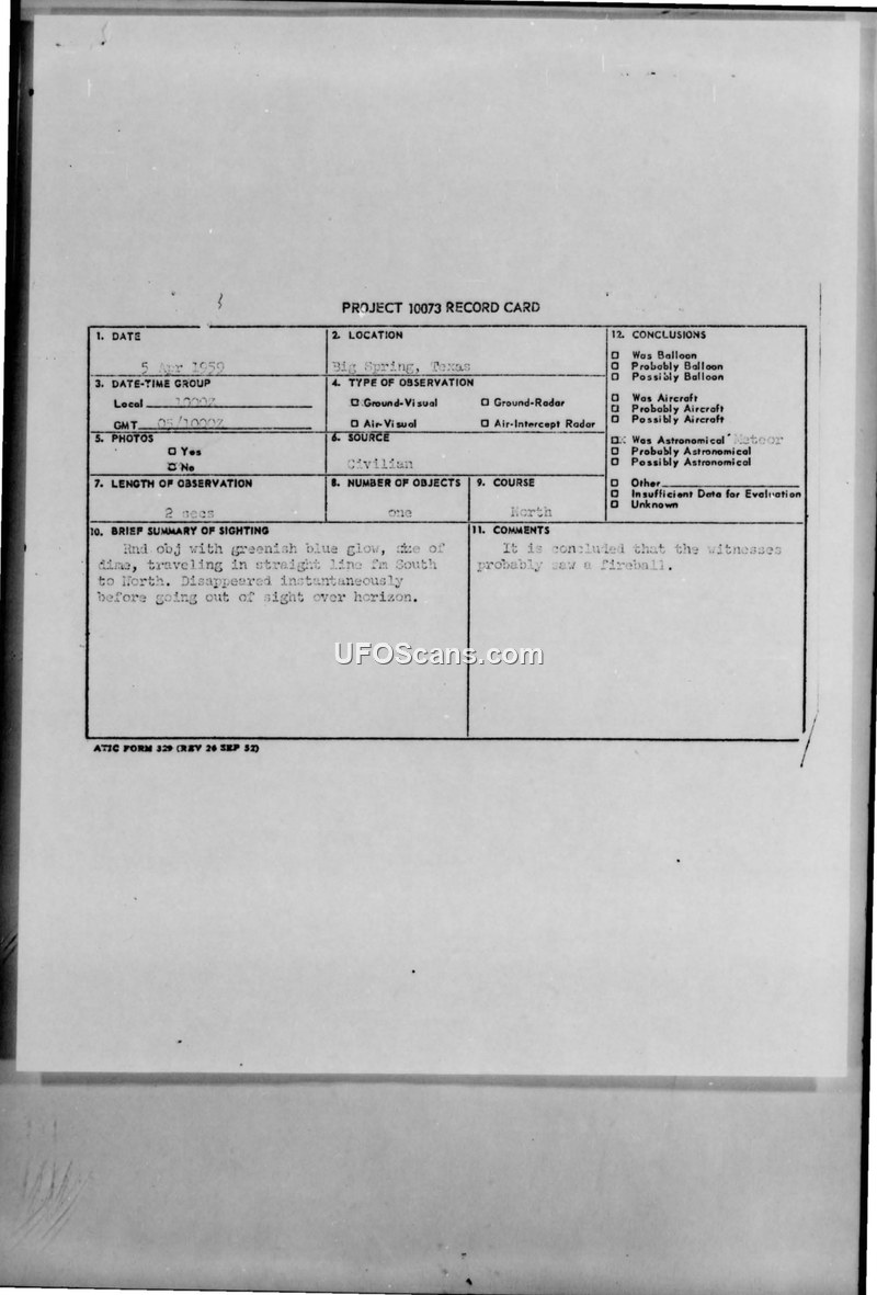 Project 10073 Record Cards and Related Reports — Big Spring, Texas, April 1959