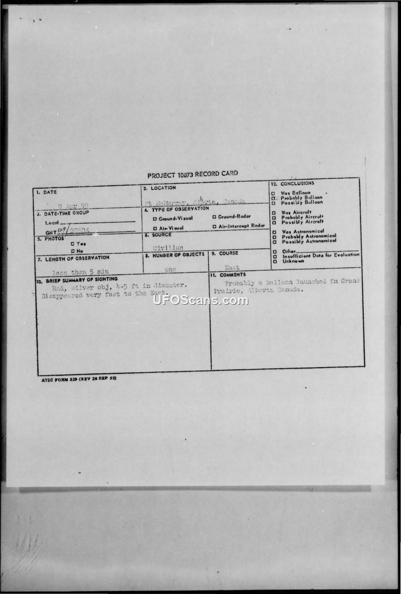 A civilian reported a round, silver object in Fort McMurray, Alberta, on April 9, 1959. The Air Technical Intelligence Center concluded the object was likely a weather balloon.