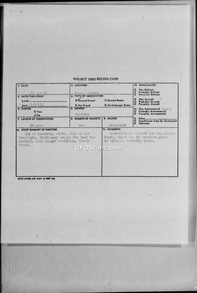 A 1950 sighting of a stationary, white, teardrop-shaped object in Yuma, Arizona, was investigated by ATIC. The phenomenon was officially concluded to be the planet Venus based on positional data.