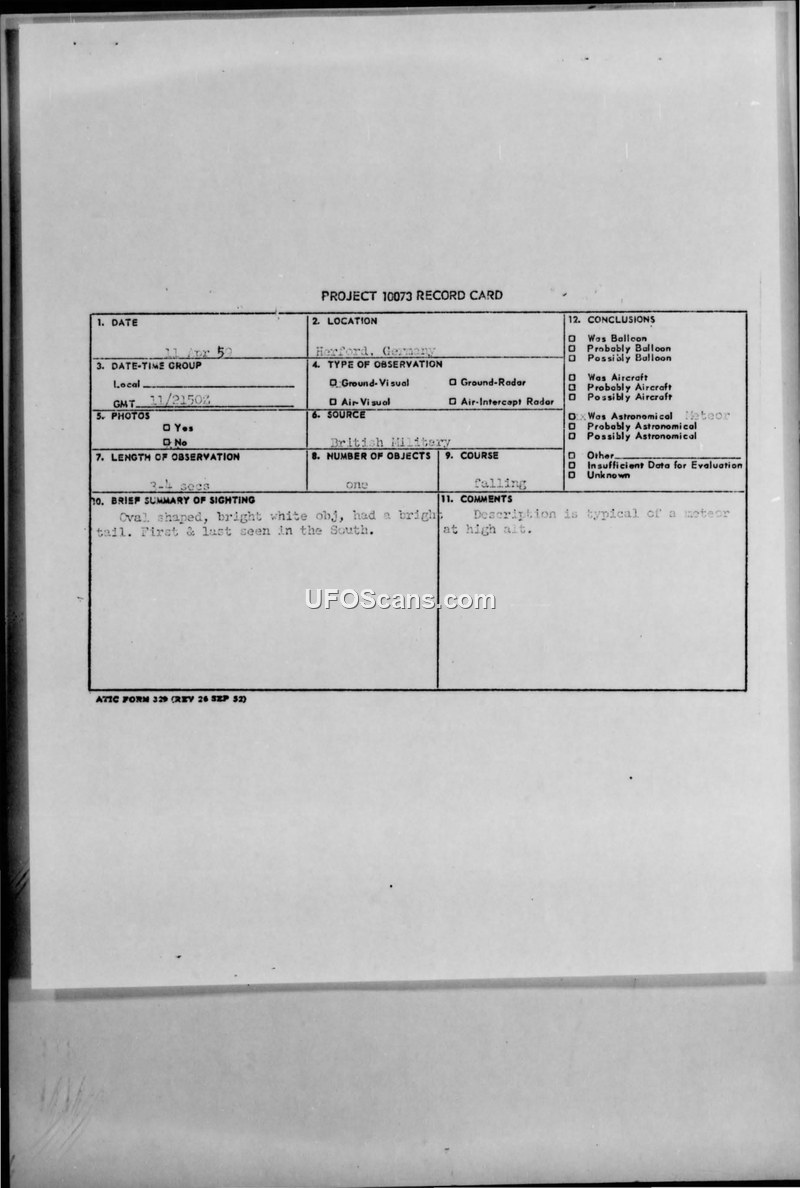 Project 10073 Record Card — Herford, Germany, 11 April 1959