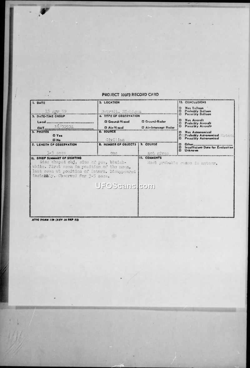 Project 10073 Record Card and UFO Report — Detroit, Michigan, 15 April 1959