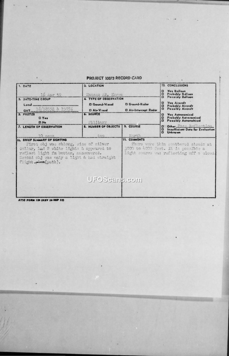 Project 10073 Record Card and Composite Report — Kunsan AB, Korea, 16 April 1959