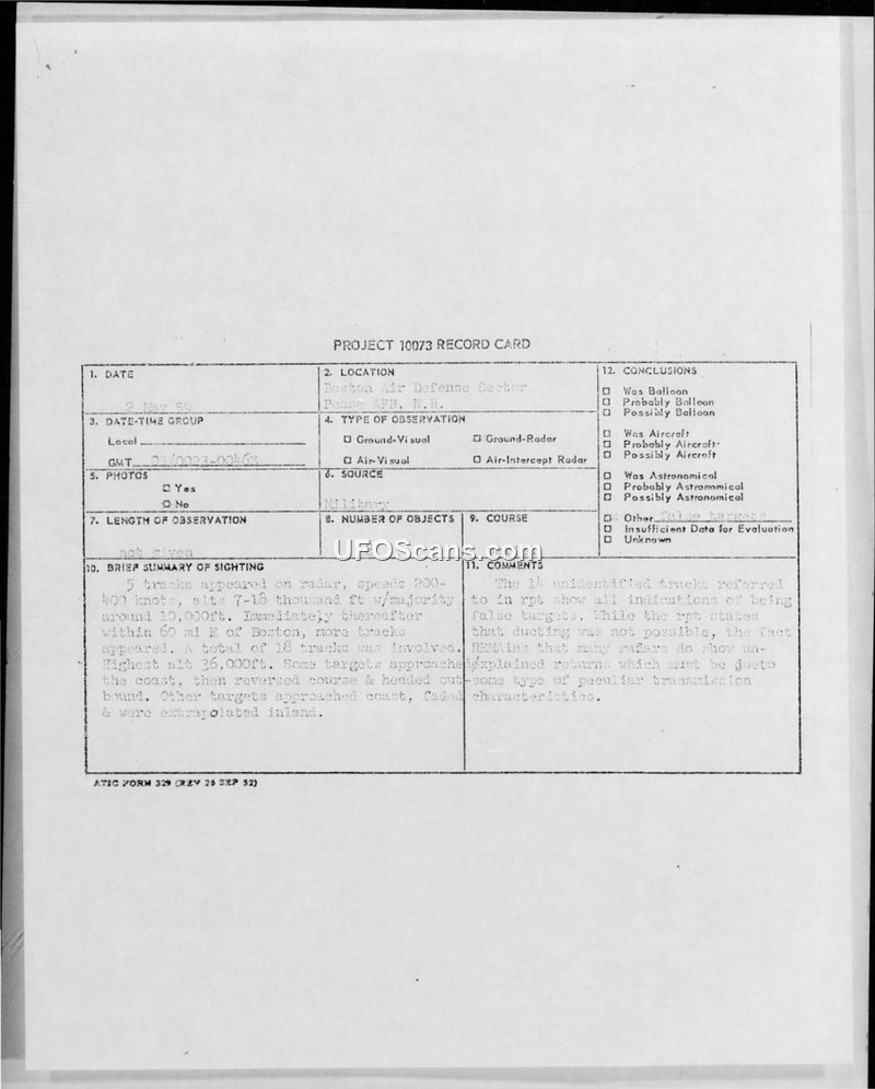 On May 3, 1959, 18 unidentified radar tracks were detected near Boston, triggering a military response. ATIC later concluded these were false radar returns caused by peculiar transmission characteristics.