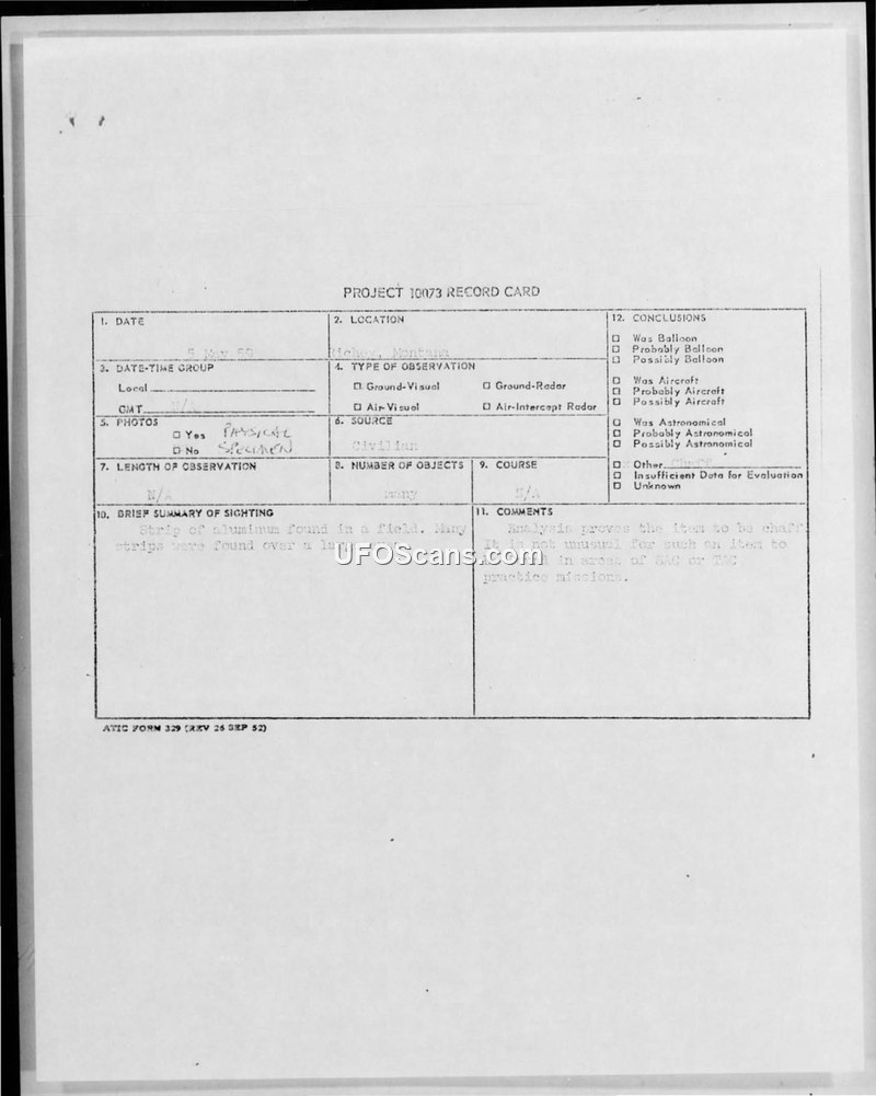 A civilian reported finding aluminum strips in a field in Montana. The Air Force analyzed the material and identified it as military chaff dropped during a practice mission.