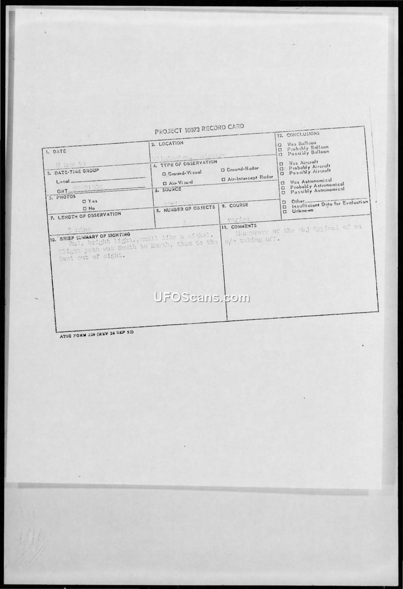 A civilian in Wilmington, Delaware, reported a round, bright, nickel-sized object moving vertically and then east on May 9, 1959. Military personnel were notified, and the incident was documented under Project 10073, with an internal note suggesting the maneuvers resembled an aircraft taking off.