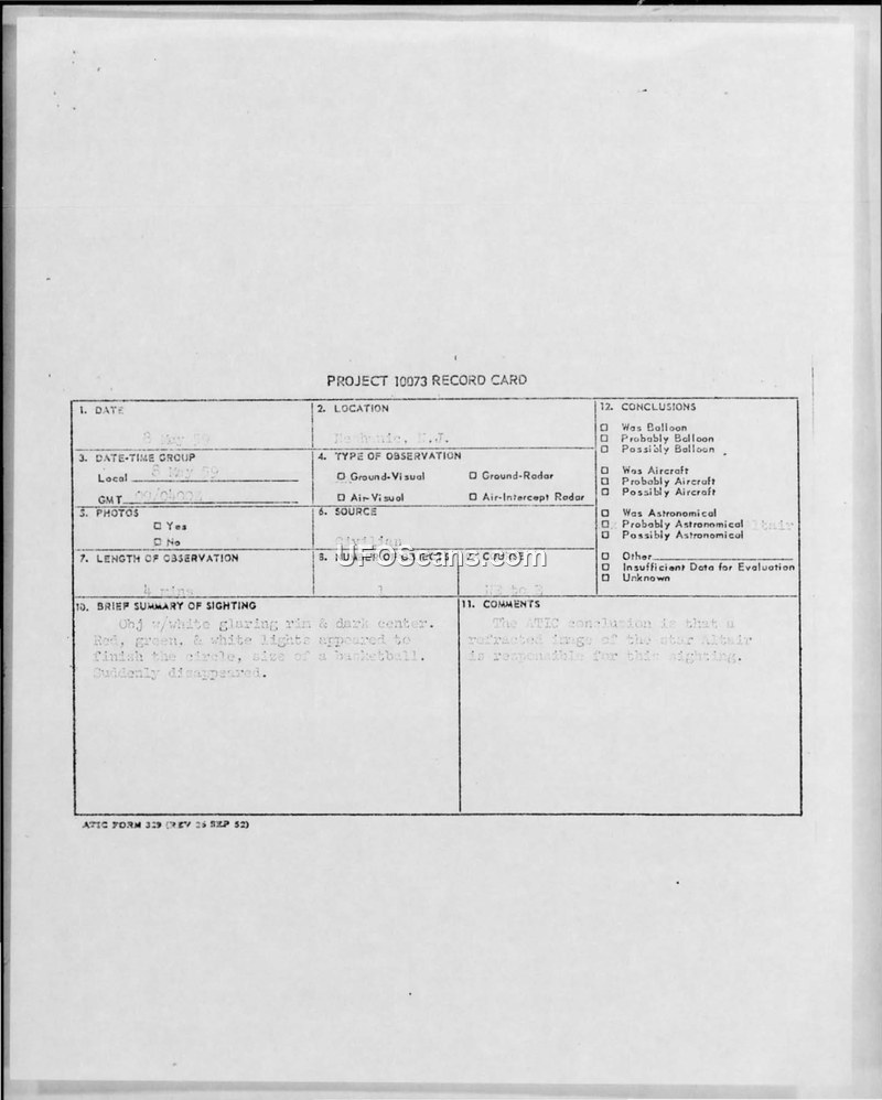 Project 10073 Record Card — Mechanic, N.J. Sighting, May 1959