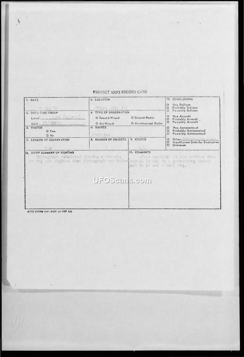 The Air Force investigated a photograph of a streak taken at O'Hare Air Force Base in 1959. They concluded the streak was a photographic processing defect rather than a UFO.