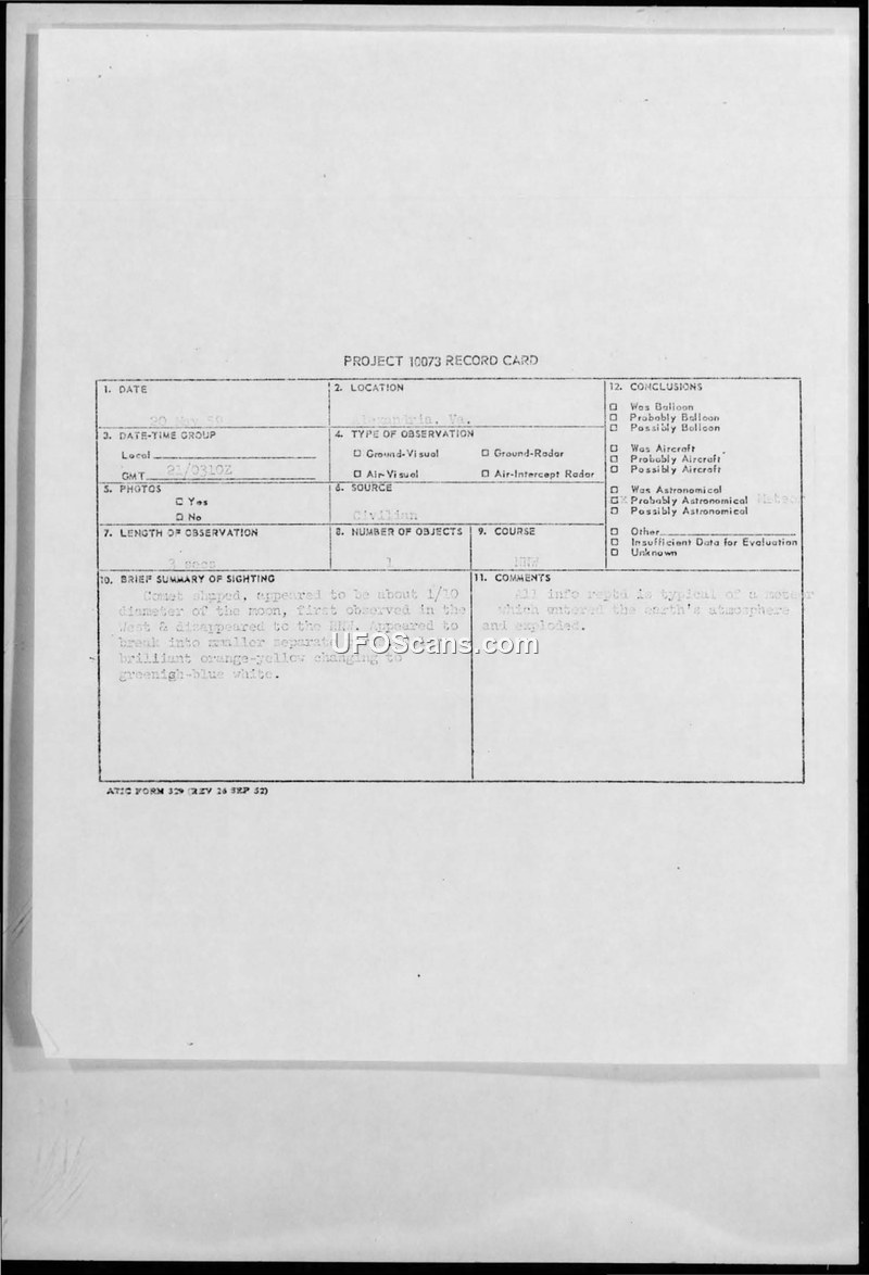 This document consists of a Project 10073 record card and supporting documentation regarding an aerial sighting reported on May 20, 1959, in Alexandria, Virginia. The witness, a male resident of Alexandria, contacted the Pentagon after observing a phenomenon at approximately 2310 hours. He described the object as comet-shaped, appearing to be about one-tenth the diameter of the moon. The object was first observed in the west and traveled toward the north-northwest, maintaining a course at 40 degrees above the horizon before breaking into smaller, separate parts. The witness noted the color changed from a brilliant orange-yellow to a greenish-blue white, and he observed a trailing tail of lesser brightness. The observation lasted approximately three seconds and was accompanied by no sound. The witness, who has a background in meteorology, stated that he had previously observed meteors and believed this event was the re-entry of an artificial satellite or a meteor. Major Smiley, the Staff Duty Officer at AFCIN, Hq USAF, confirmed that the witness was responsible and that his report was consistent with other sightings reported to Andrews Ops and local sheriff's offices at the same time. The official conclusion recorded on the project card is that the sighting was typical of a meteor entering the earth's atmosphere and exploding. The witness provided detailed responses to the ATIC form 16h questionnaire, noting that he had perfect vision and was observing from his yard in a residential section. He explicitly requested that his identity remain private and that there be no publicity regarding his report.