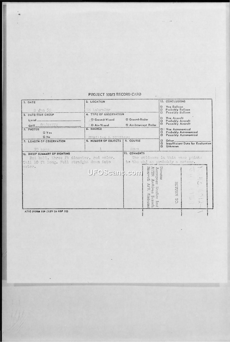A red, ball-shaped object with a tail was observed falling into the water in Labrador on June 2, 1959. Military and ground observers reported the event, which was officially concluded to be a meteor or flare.