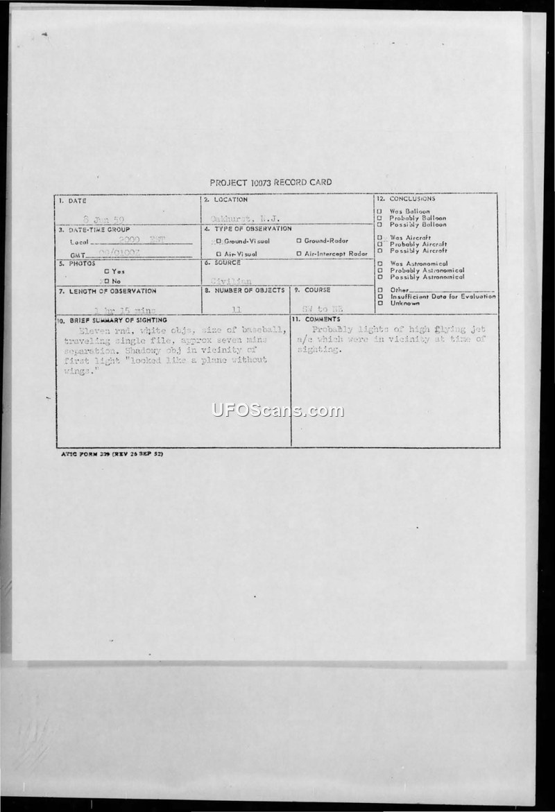 A sighting of eleven unidentified objects in Oakhurst, New Jersey, on June 9, 1959, was investigated by the New York Air Defense Sector. The military concluded the objects were likely a flight of B-47 aircraft.